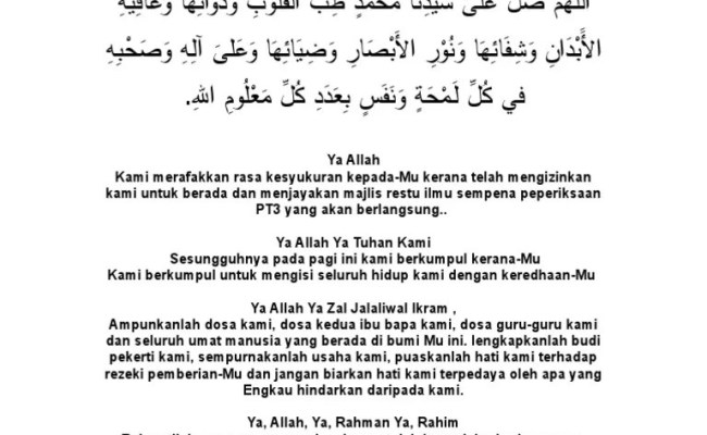 Ampunilah dosaku dan dosa kedua orang tuaku dan kasihilah mereka sebagaimana mereka mengasihiku sejak kecil." 2. Karena di dalam doa penutup acara terdapat banyak sekali maknanya. 19.02.2015 · pdf | on feb 19, 2015, padly alpatanni published hubungan etnik di malaysia. 11) bacaan doa kenduri kesyukuran. Bahawa doa itu terhenti di antara langit dan bumi, tidak akan diangkat ke langit sehingga kamu membacakan selawat ke atas nabimu, nabi saw.